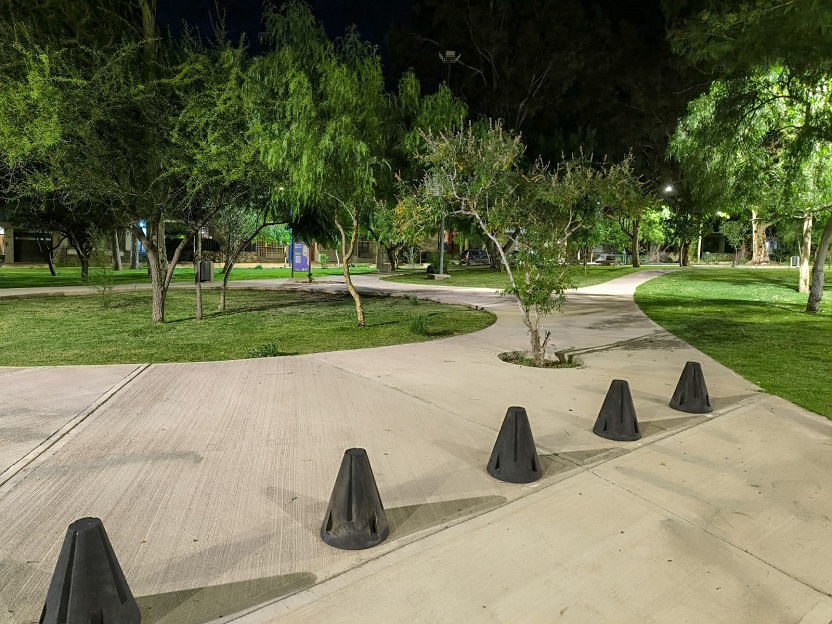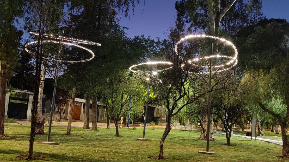 La intervención sumó elementos distintivos que aportan identidad al lugar. Entre ellos, se destacan tres árboles lumínicos de estructura metálica, revestidos con cintas LED, que brindan iluminación nocturna y un toque estético contemporáneo.