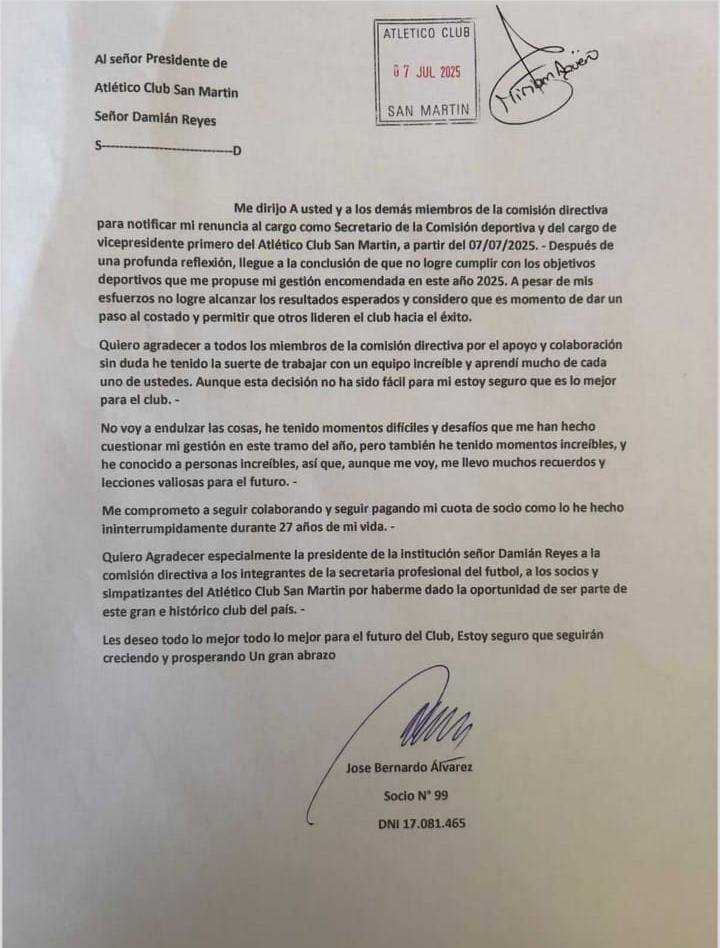La Nota que presentó el ex dirigente en la jornada de hoy en la sede de Calle Lavalle.