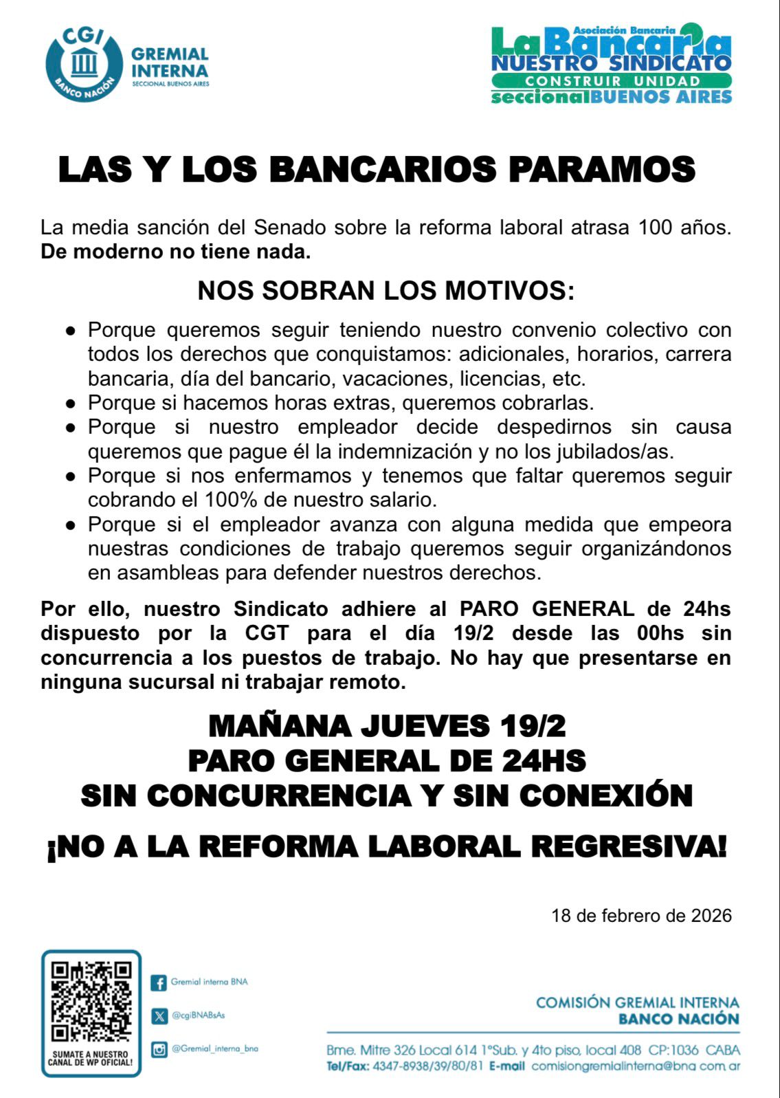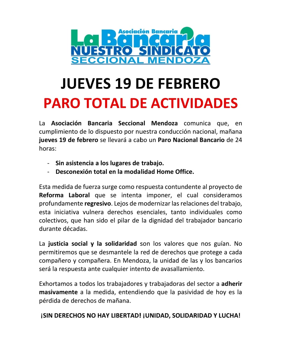 La Asociación Bancaria Mendoza confirmó paro total, para mañana jueves 19. De acuerdo a lo manifestados por las autoridades sindicales de la Provincia tienen una adesión total al paro Nacional.