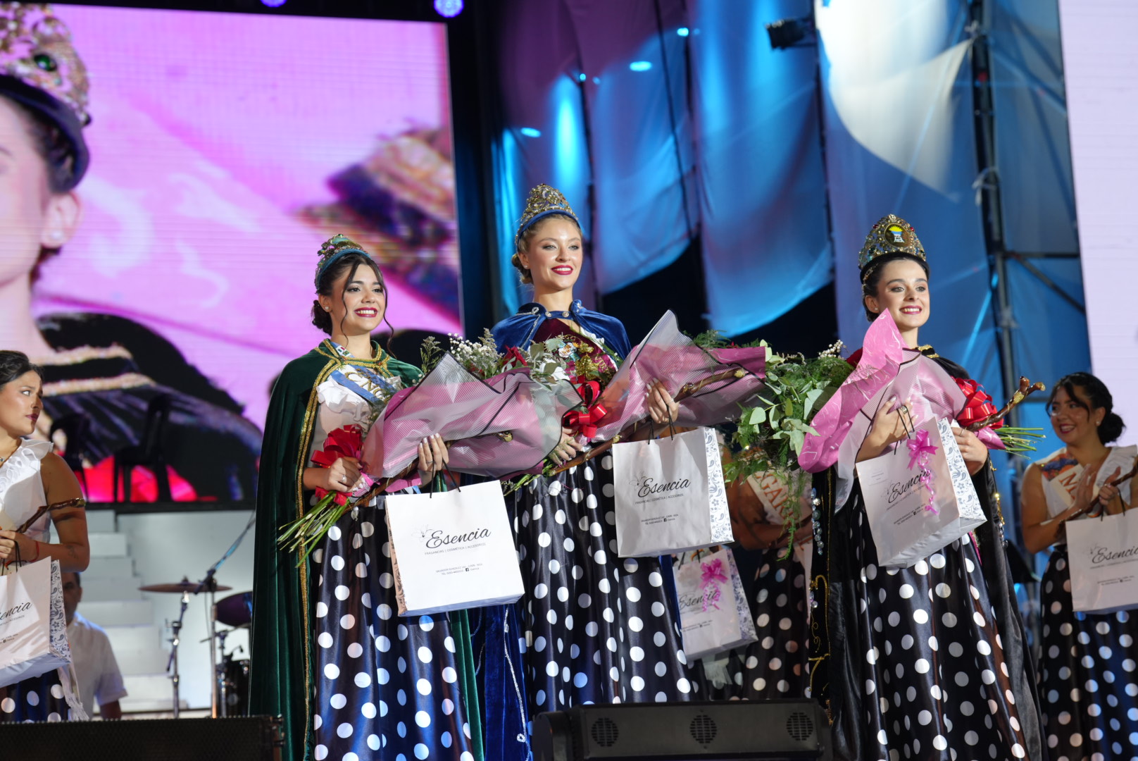 El momento cúlmine de la noche llegó con la elección y coronación de las nuevas soberanas, donde Mara Lizana Muñoz, representante de Ciudad, fue elegida Reina Departamental de la Vendimia. Además, Candela Caballero, de Alto Verde, fue coronada Virreina; y Julieta Consoli, de Ingeniero Giagnoni, se consagró Reina del Encuentro de las Naciones.