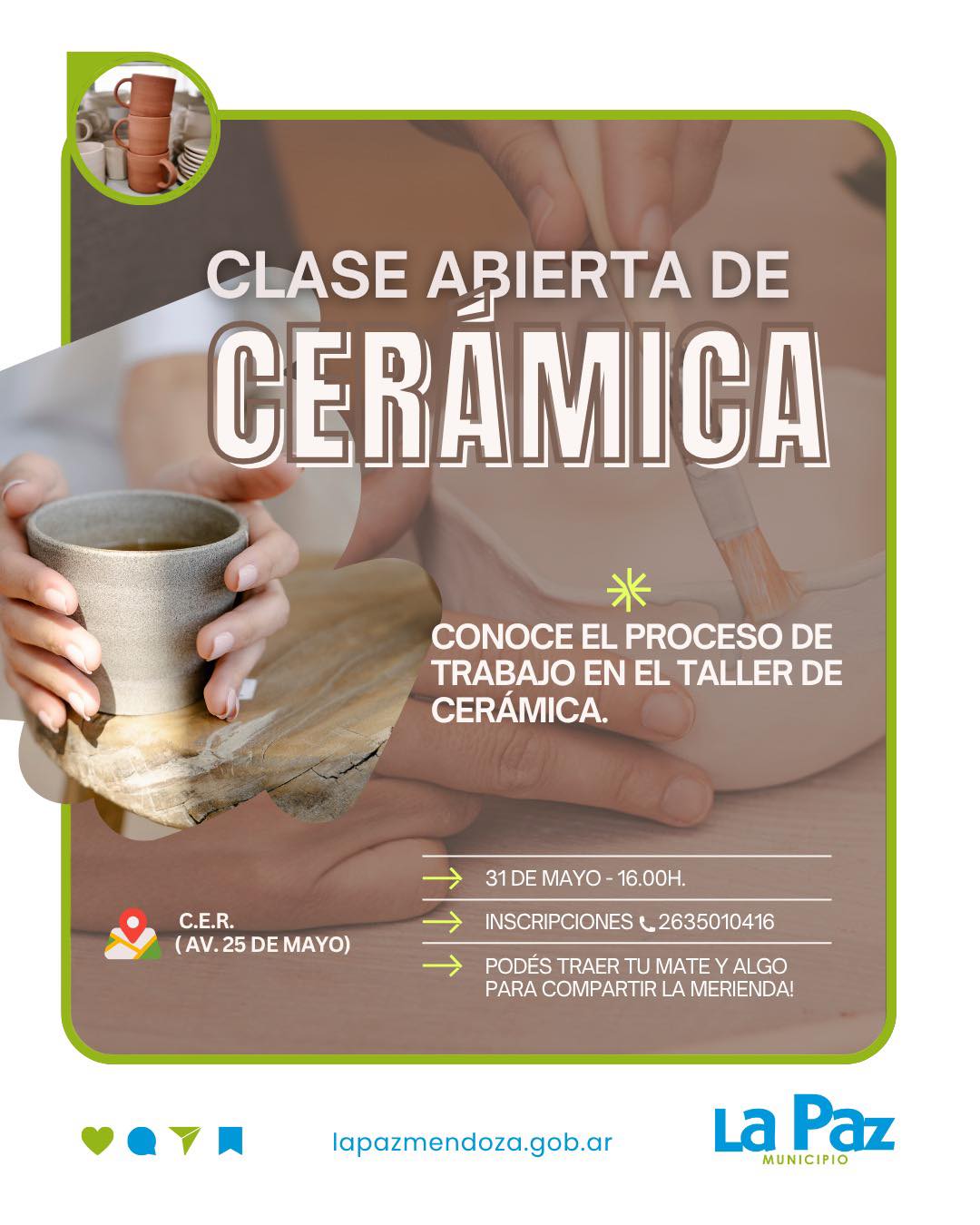 El Taller Municipal de Cerámica invita a una clase abierta este sábado 31 de mayo a las 16 h en el C.E.R. (Av. 25 de Mayo), donde se compartirá el proceso de trabajo artesanal que realizan las y los participantes del espacio.