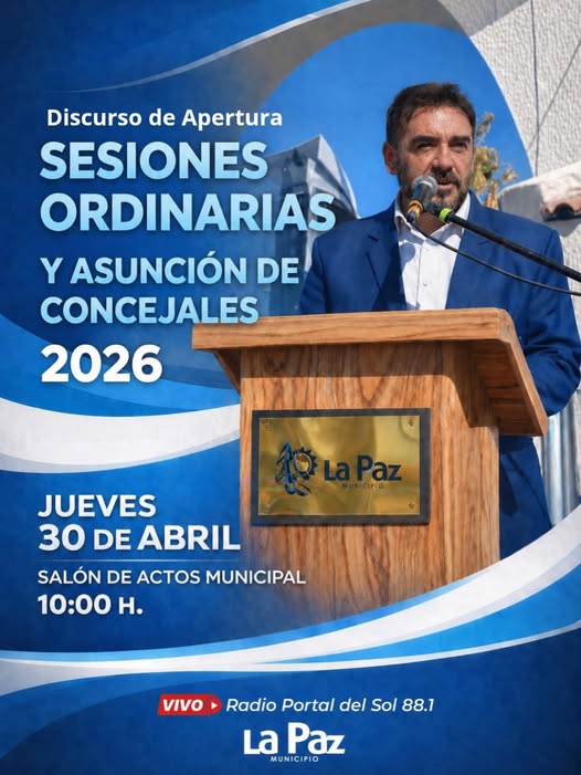 En el mismo acto se realizará la asunción de concejales del Honorable Concejo Deliberante de La Paz. El discurso será transmitido en vivo por FM 88.1 Portal del Sol.