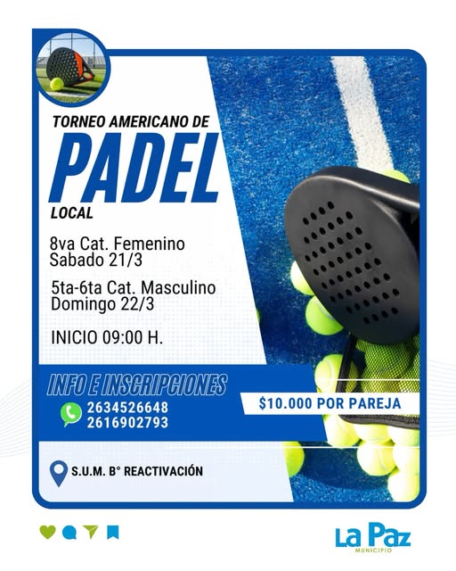 El sábado 21 y domingo 22 de marzo, desde las 9 h, se disputará un Torneo Americano de Pádel en el S.U.M. Barrio Reactivación.