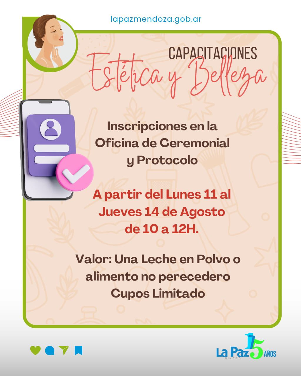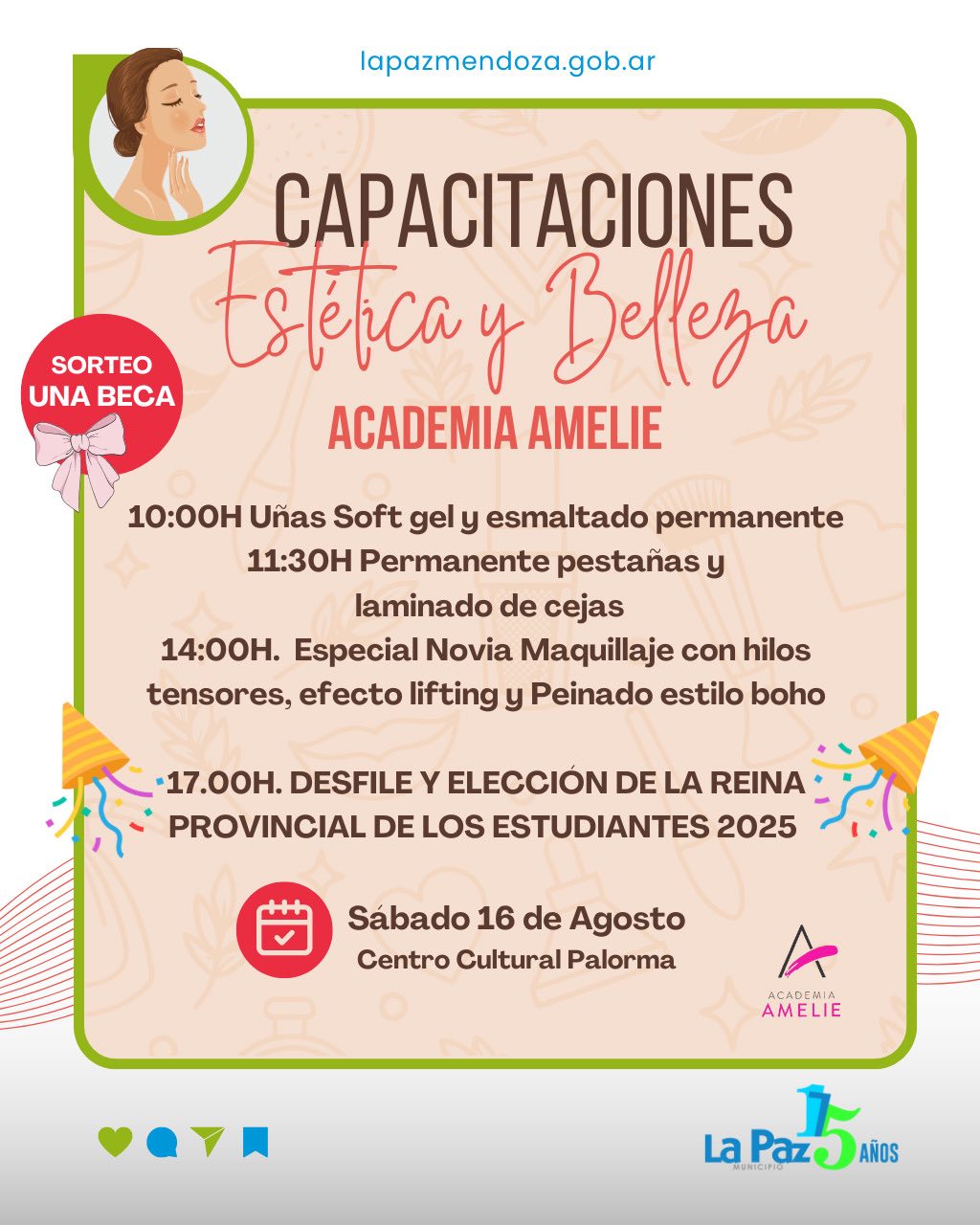 El Municipio invita a los interesados a participar de las capacitaciones en Estética y Belleza que se realizarán el sábado 16 de agosto, de 10 a 17 h, en el Centro Cultural Palorma, a cargo de especialistas de la Academia Amelie.