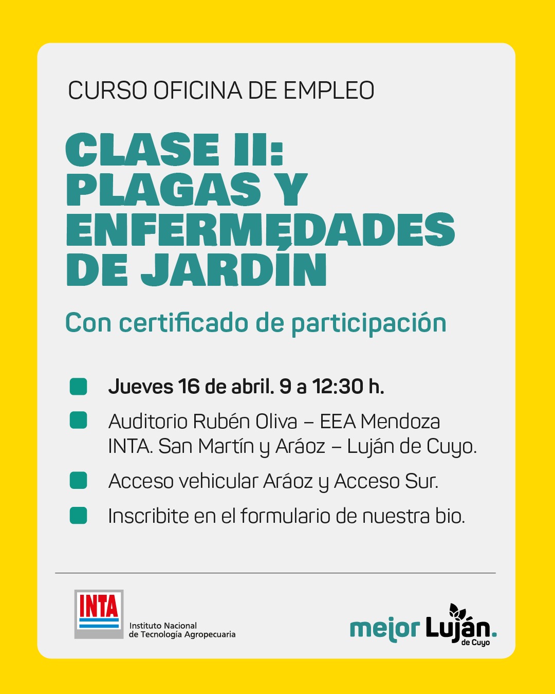 Desde la Oficina de Empleo de la Municipalidad de Luján de Cuyo, junto al INTA, te invitamos a participar de la Clase II: Plagas y enfermedades de jardín, pensada para quienes quieren sumar conocimientos y mejorar sus servicios
