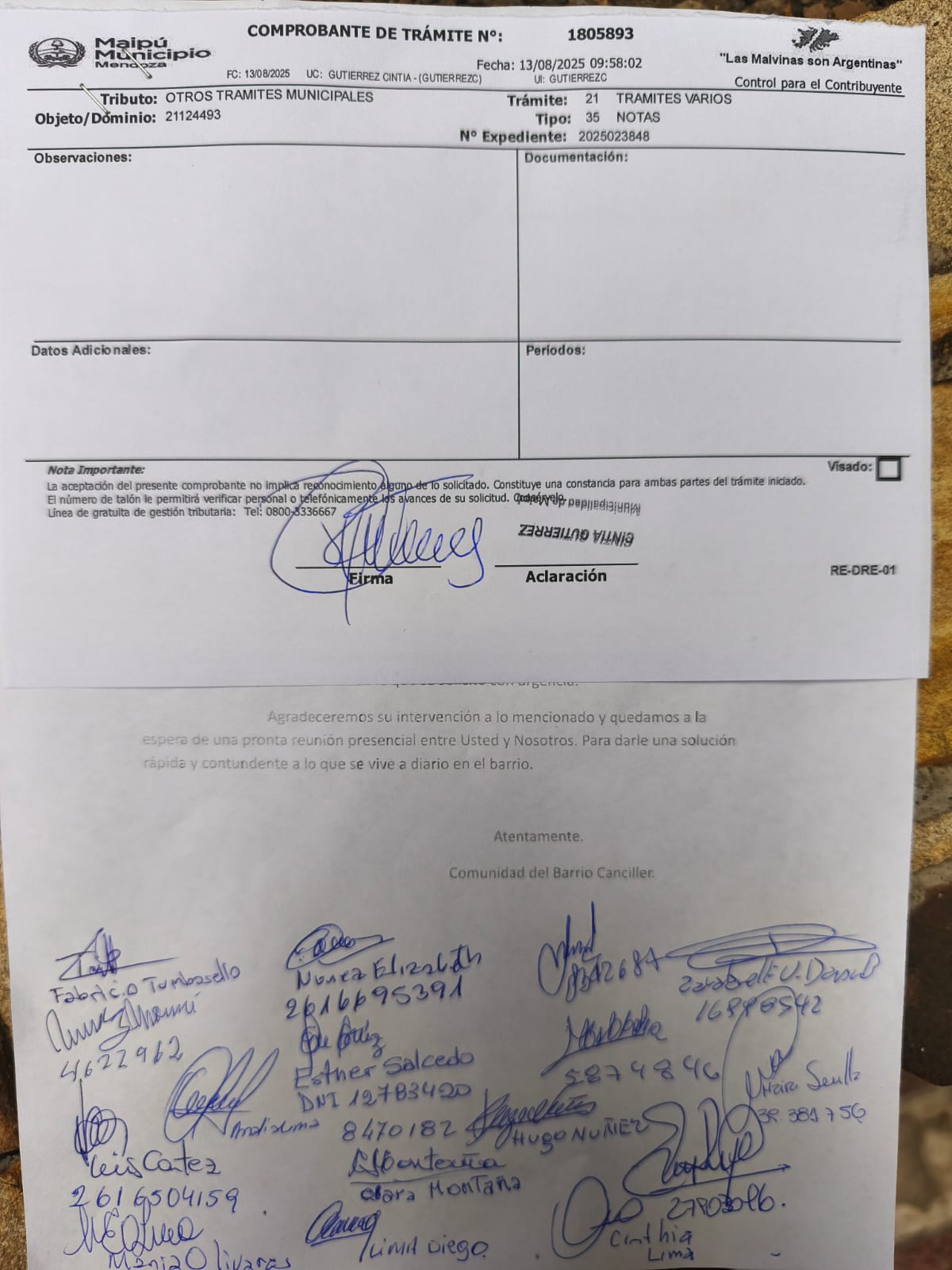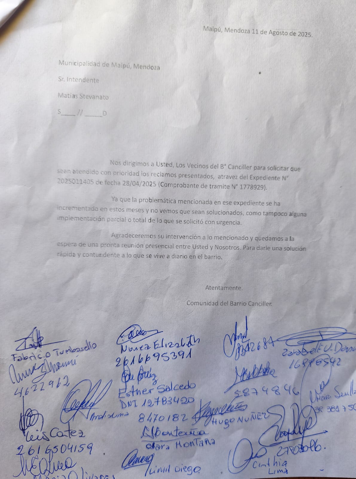 Según lo que manifestaron algunos vecinos de Maipú a nuestro medio, el reclamo es en calles cercanas al Parque Metropolitano, que son Gargantini y J.B. Martínez y lateral norte Emilio Civit y lateral a Juan José Paso. Una vecina dialogó con nuestro medio y dijo: «La problemática es que en los alrededores del parque y dentro del mismo, suceden cosas muy graves como picadas de autos y motos; consumo de alcohol y de drogas, y nadie del municipio hace nada al respecto y no atienden el reclamo de los vecinos».