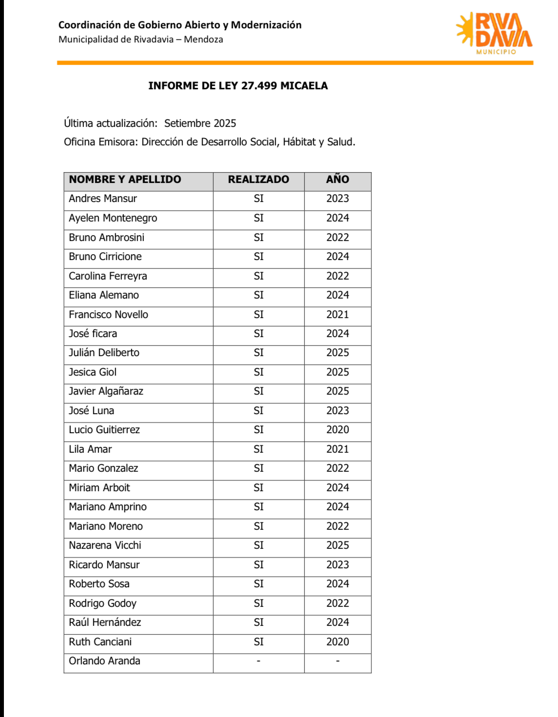 Por otro lado, todos los funcionarios de Rivadavia tuvieron que hacer el curso de La Ley Micaela que es una capacitación obligatoria en temas de género y violencia contra las mujeres para aquellos que desempeñan una función pública. Sin embargo, la única persona que no realizó el curso fue Orlando Aranda, Secretario de Hacienda y denunciado por violencia de género.