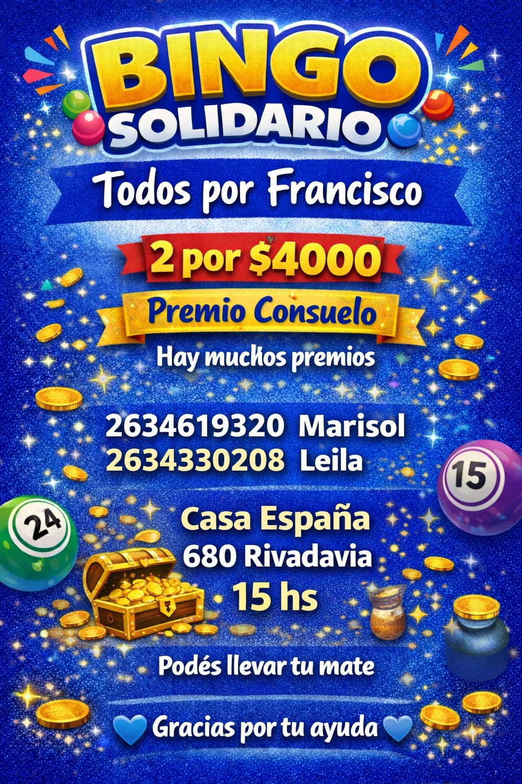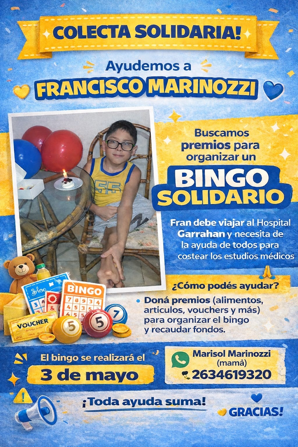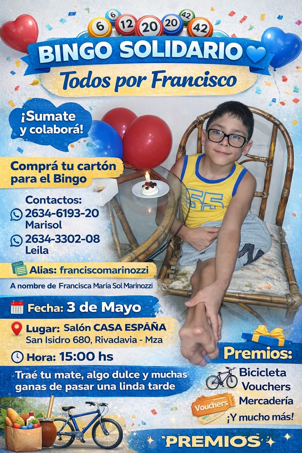 Para poder ayudar en esta causa, podrás hacerlo donando premios como alimentos, artículos, vouchers, órdenes de compra y más; para recaudar la mayor cantidad de fondos posibles en el viaje de Francisco a Buenos Aires. El bingo solidario se realizará el próximo domingo 3 de mayo en Casa España, ubicada en calle San Isidro 689 de Rivadavia a las 15 horas. Para colaborar, pueden comunicarse al 2634619320.