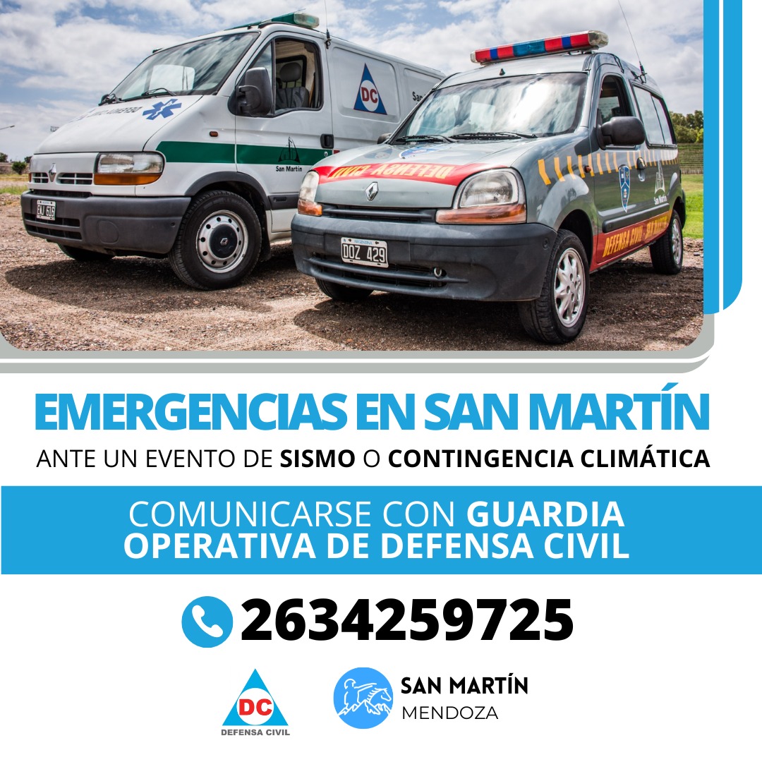 La dirección de Defensa Civil se ubica en Almirante Brown 75, de San Martín. El teléfono de la guardia es el 263 4259725.