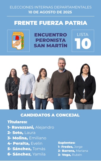 La lista que encabeza Alejandro Ravazzani se llama ‘Fuerza Patria’ y según lo que declaró a nuestro medio: «Yo voy primero, después está Laura Soto que es docente; Emiliano Molina que viene del Frente Renovador; Evelin Peralta que es docente de Montecaseros; Edgardo Sánchez que representa a los sindicatos y Yamila Sanchez que trabaja en un merendero del barrio Aguaribay de Palmira».