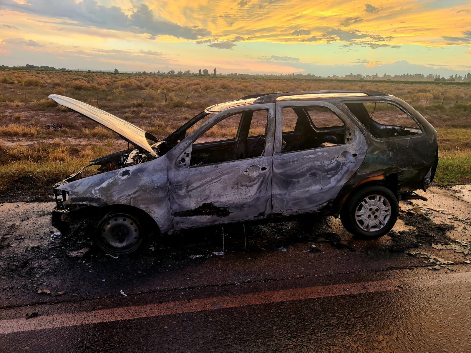 Pasadas las 20, en el kilómetro 980 de la Ruta Nacional 7, a la altura del distrito 12 de Octubre del departamento de Santa Rosa, un Fiat Palio Weekend se incendió mientras circulaba por la ruta. El conductor detuvo su marcha, en el lugar se hizo presente personal de Bomberos de la Policía de Mendoza Delegación Santa Rosa quienes sofocaron con motobomba y línea de baja pesión hasta extinguir de manera total las llamas, pero las pérdidas en el vehículo fueron totales.